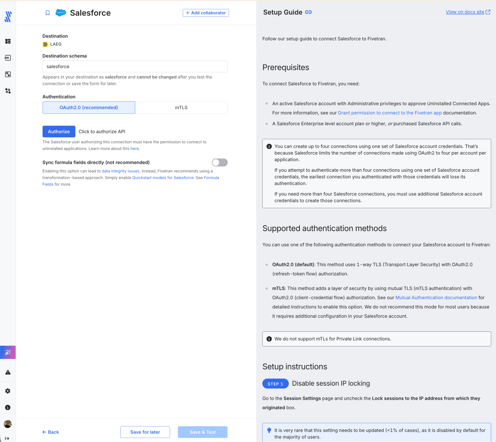 In this example, I’m going to load the Fivetran Log data into ClickHouse but below is the form showing how simple the setup is to authenticate and get data from your Salesforce system into ClickHouse.