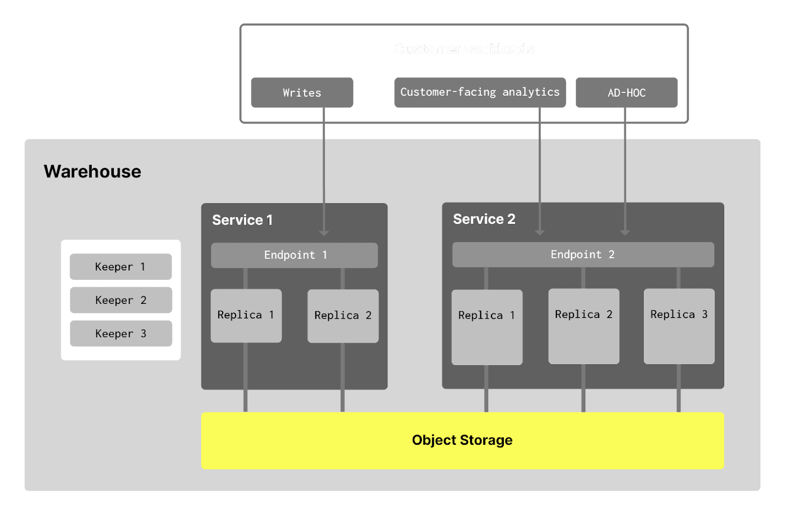 To set up Warehouses, navigate to the ClickHouse Cloud console and add a secondary service to your existing warehouse. You can then configure the Fivetran destination to connect to your dedicated write service while pointing your Analytics tools like Hex or Microsoft Power BI at the read service. For step-by-step instructions, see the ClickHouse Cloud Warehouses documentation.