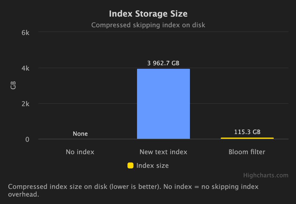 Historically, users accelerated string search in ClickHouse with Bloom filter–based skip indexes. While useful, Bloom filters are probabilistic and operate at granule level, meaning they can produce false positives and only answer coarse set-membership questions such as whether a token may exist in a range of data. They also require careful tuning and do not natively support multi-token search. Text indexes take a fundamentally different approach. They build a deterministic inverted index over tokens, storing row-level information that enables precise term lookups with no false positives from the index itself. While text indexes are larger than Bloom filters, they deliver significantly better scalability and performance for large text corpora are now the recommended approach to string matching at scale.