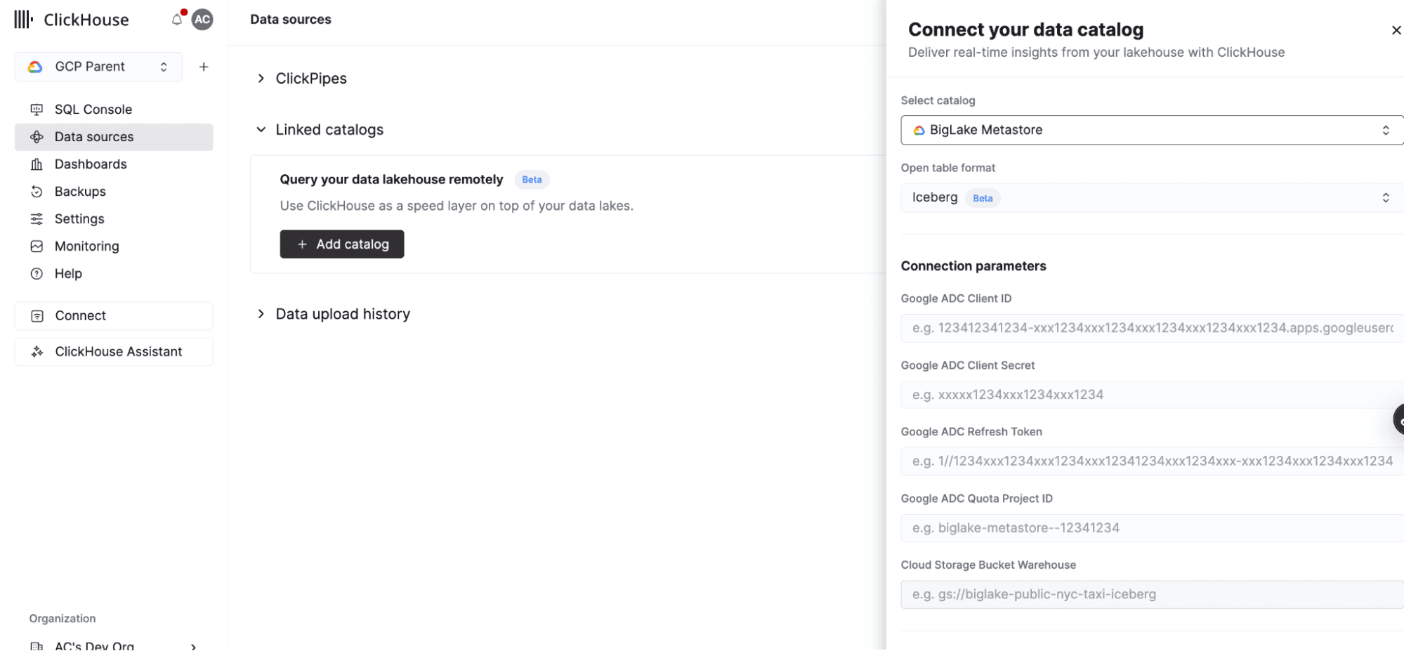 - Enhanced cloud integration: Introducing a new user interface in ClickHouse Cloud to easily create connections to the Lakehouse Runtime Catalog and query your data directly from the UI.