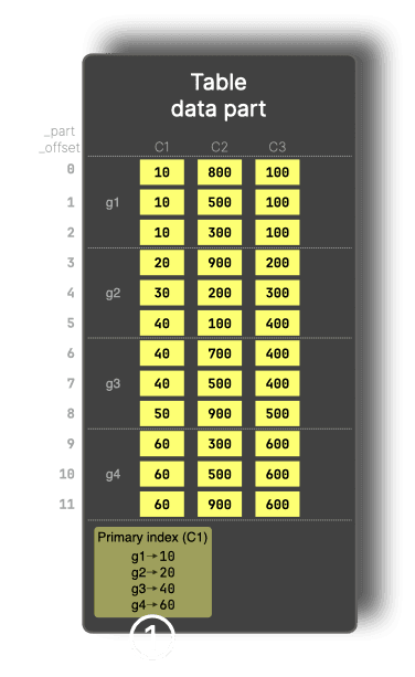 In the diagram below, data is sorted by the primary key, C1, and rows are organized into granules (g1 to g4). We use 3 rows per granule in this diagram for clarity. The primary index stores the first value for each granule, i.e., 10 for g1, 20 for g2, and so on.