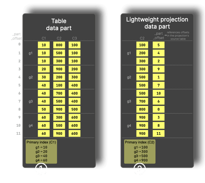 For filters on a column that is not part of the primary key, such as WHERE C2 > 900, ClickHouse can use a lightweight projection, which stores the sorted projection key (C2) values plus _part_offset values and provides its own primary index (②) that allows granules to be pruned for filters on the projection key.