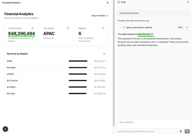 Call the MCP tool with "revenue by region this quarter" and inspect the generated SQL: