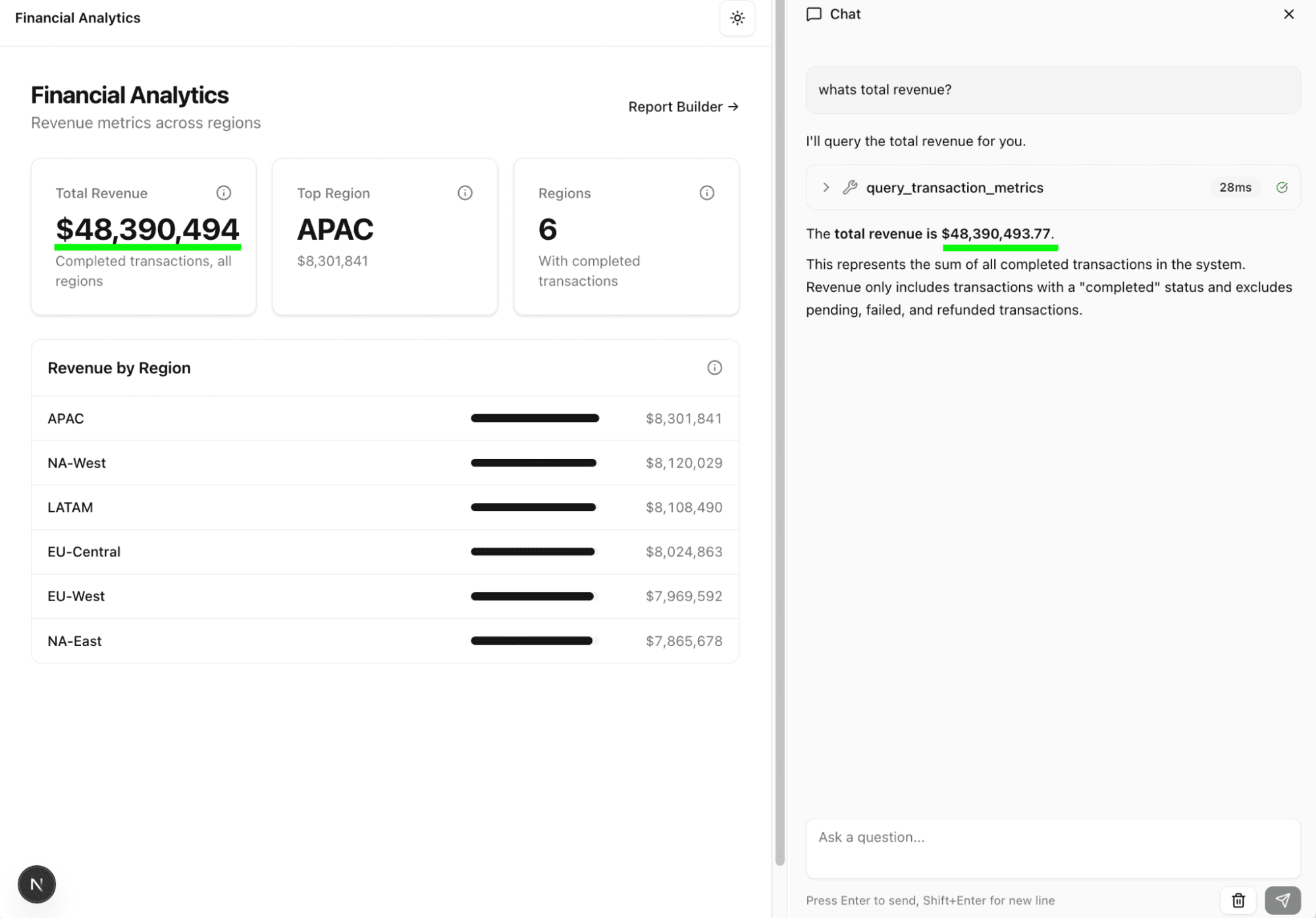 The demo app. Check out the example implementation, including frontend with dashboard, AI chat, and report builder.