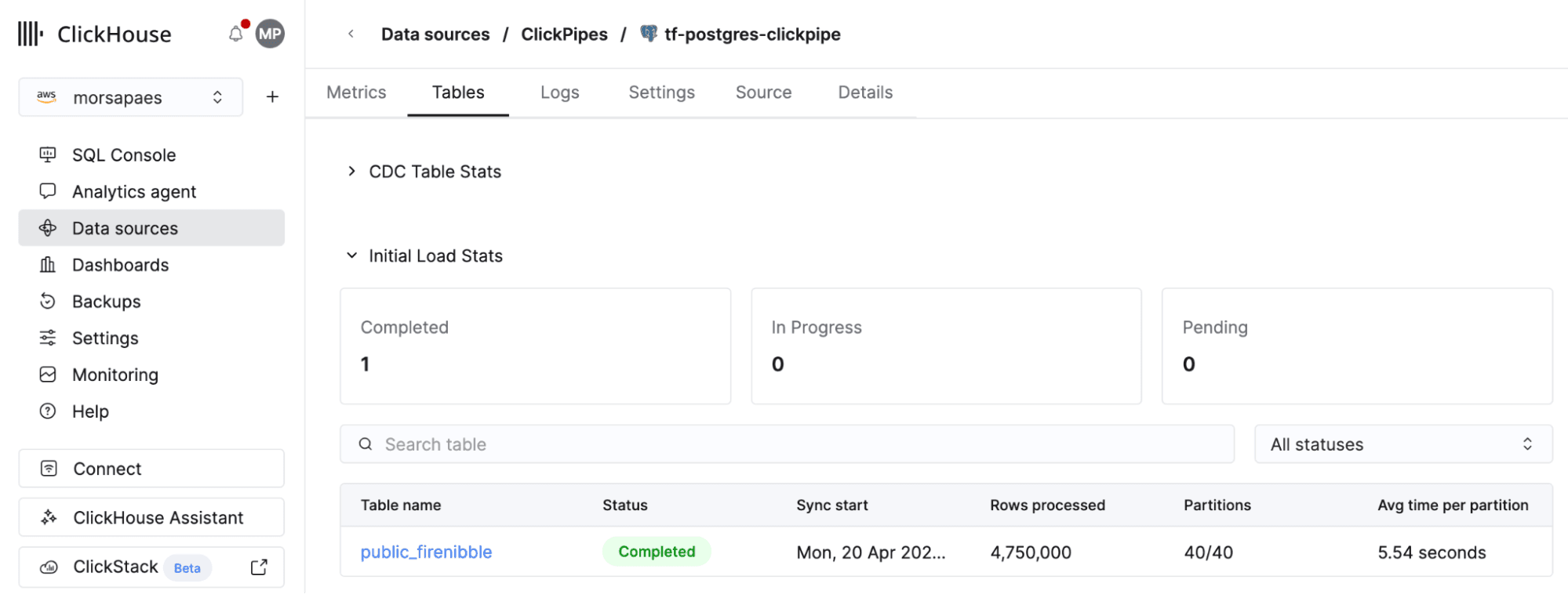 All done! Your first CDC ClickPipe created programmatically is now up and running. Head over to the ClickHouse Cloud console and double-check it is indeed there (under Data sources > ClickPipes), churning through data ingestion.