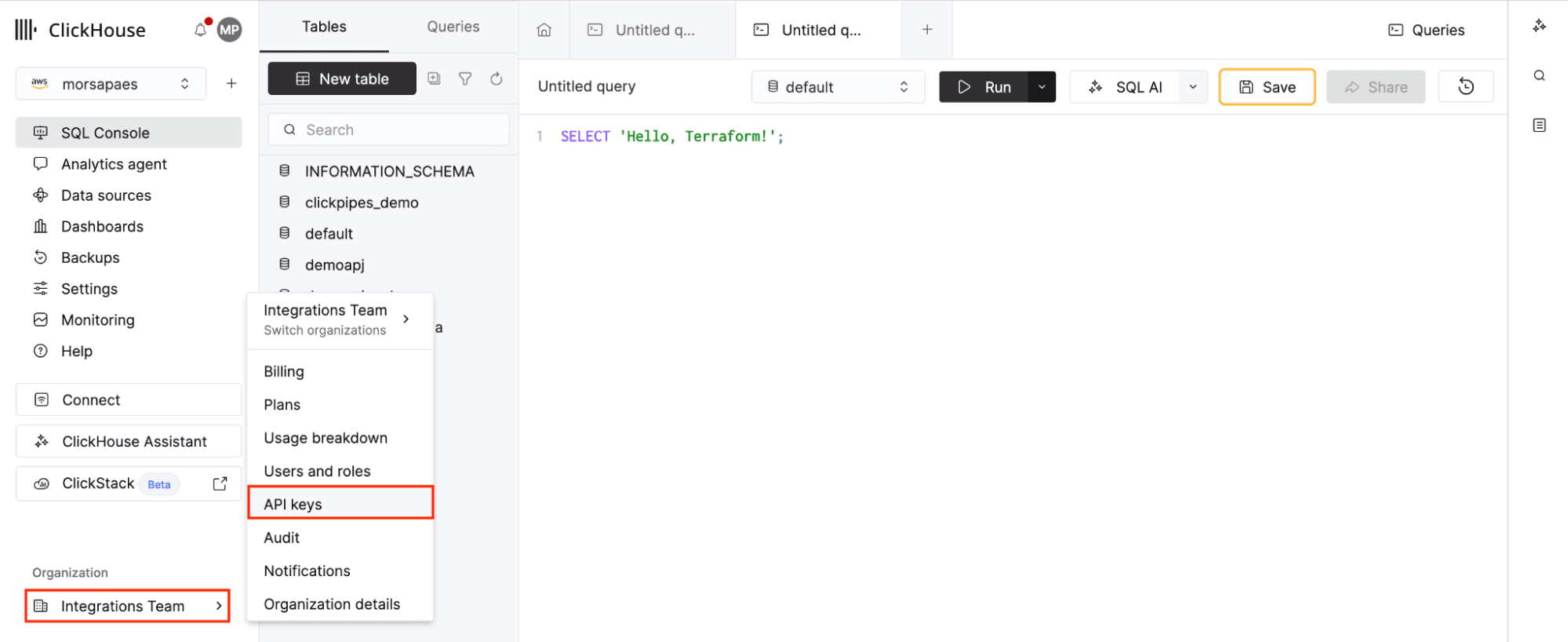 1. The ClickHouse Terraform provider uses the Cloud API to interact with your ClickHouse Cloud service, so you’ll need a valid API key for authentication. If you’re new to the provider, the first step is to create a new API key. Navigate to Organization > API keys > New API key, and note (or download) the provided Key ID and a Key Secret pair.