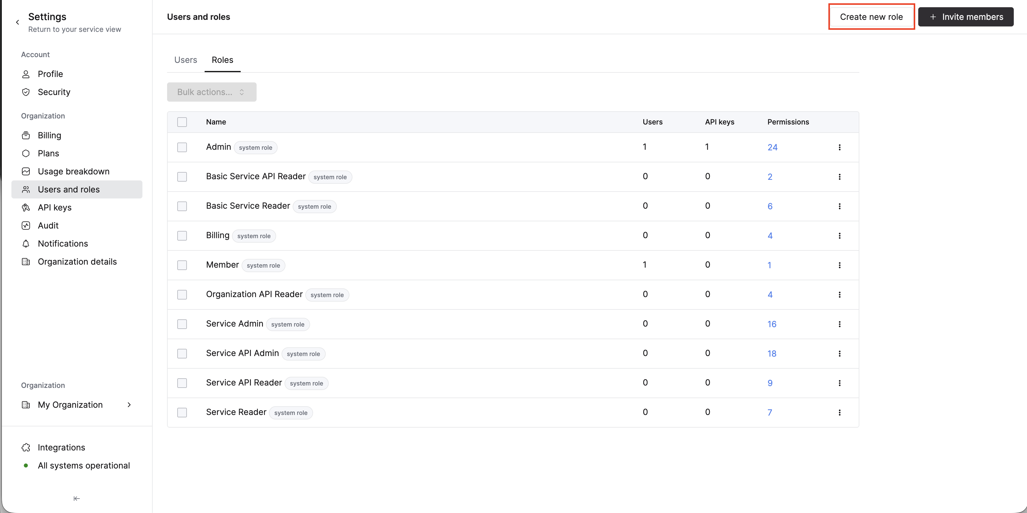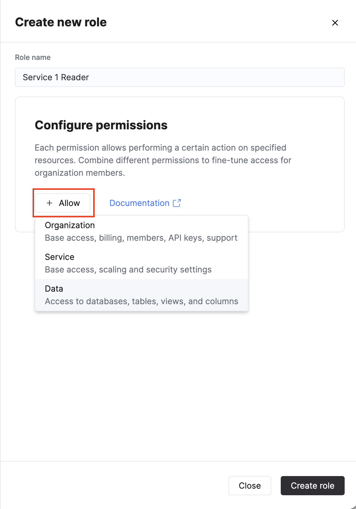 Allow ボタンをクリックし、Organization、Service、Database の権限を選択します。すべての権限の説明については、Console roles and permissions を参照してください。
