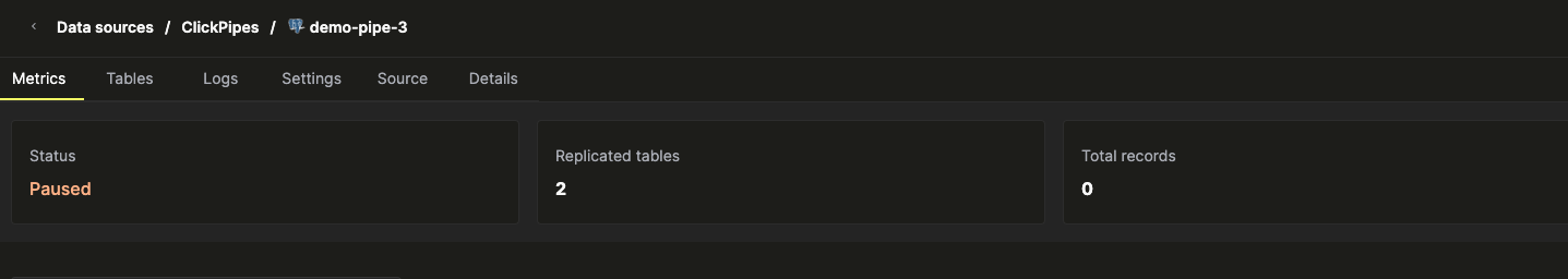 - Data Sources 탭에서 재개할 Postgres ClickPipe를 클릭합니다. 처음에는 미러의 상태가 Paused여야 합니다.
