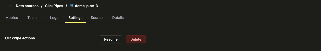 - Data Sources 탭에서 일시 중지할 Postgres ClickPipe를 클릭합니다.