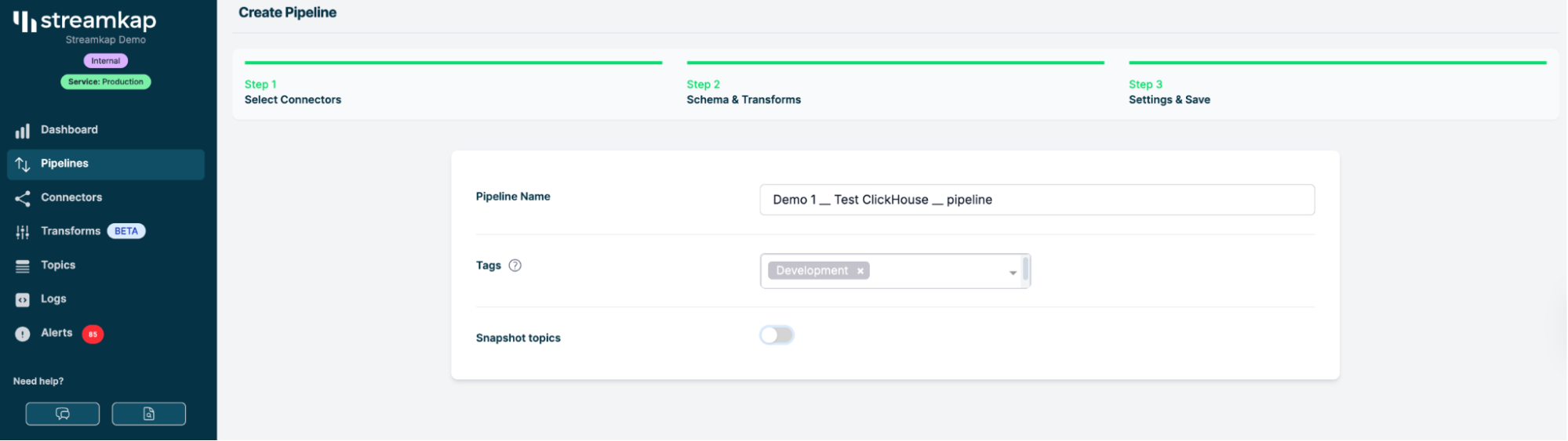 Streamkap에서 Pipelines 탭으로 이동합니다.