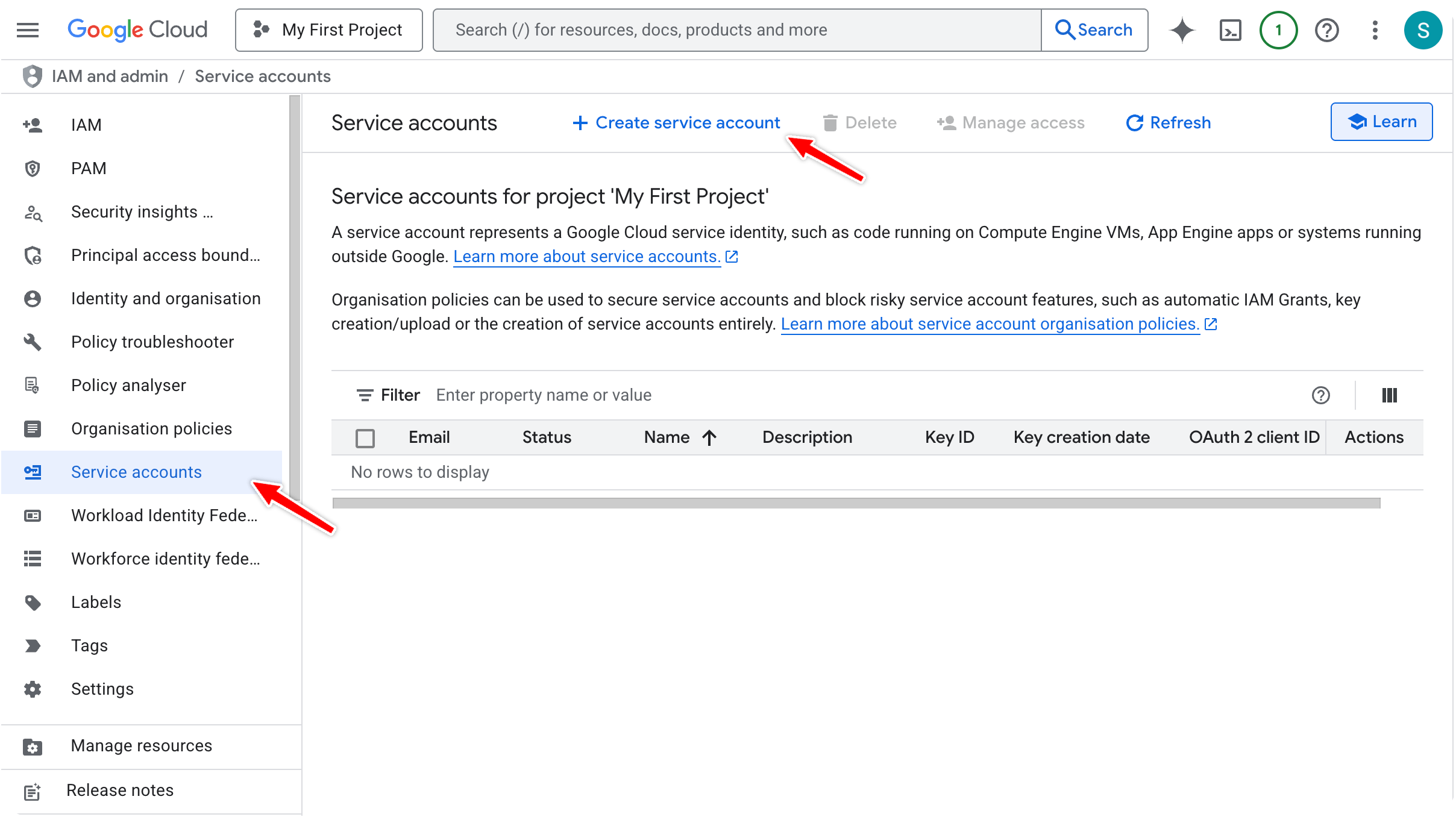 Service accounts,然后点击Create service account: