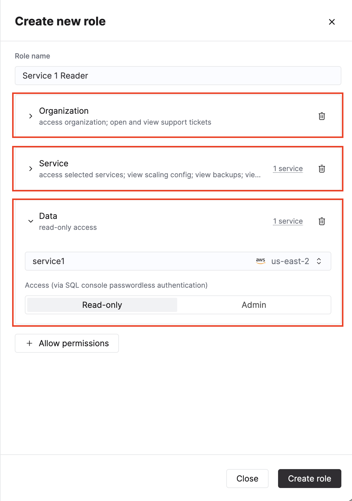 自定义角色可包含组织、服务和数据库权限的任意组合。权限可应用于全部服务和数据库,或其子集。