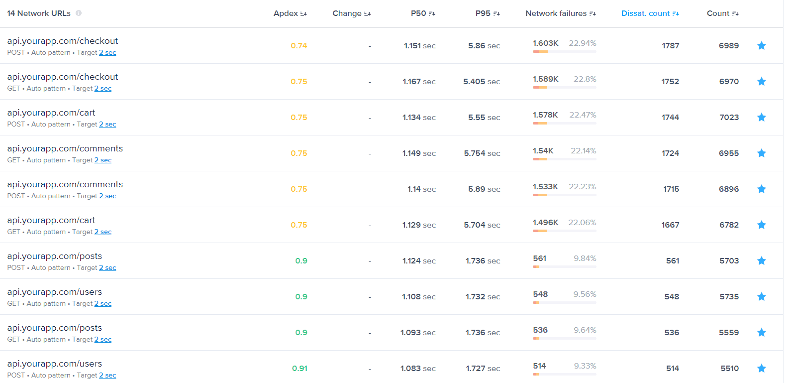 APM systems track network-related metrics across different groups of requests. This includes measuring response times and their percentiles, tracking failure rates, and calculating Apdex scores (Application Performance Index) to understand overall network health. These metrics help teams identify problematic API endpoints or service interactions that impact user experience.