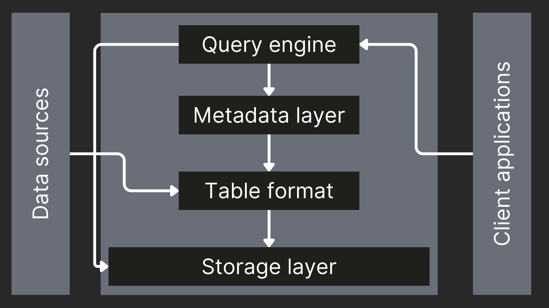 The table format layer organizes raw files into logical tables and brings database-like features, such as ACID transactions, schema evolution, time travel, and performance optimizations (e.g., data skipping, clustering). It bridges the gap between unstructured storage and structured analysis.