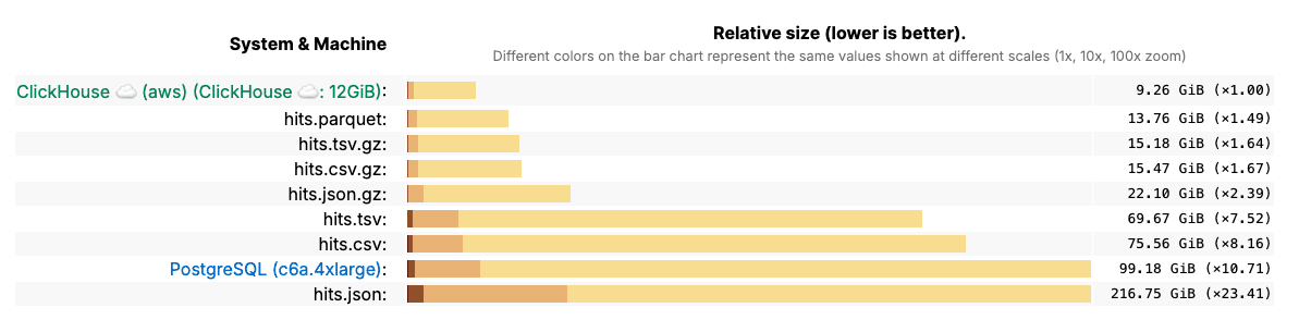 To see this in practice, the ClickBench benchmark compared storage sizes across formats. PostgreSQL, a row-based system, required far more space than ClickHouse for the same dataset of 100 million records: