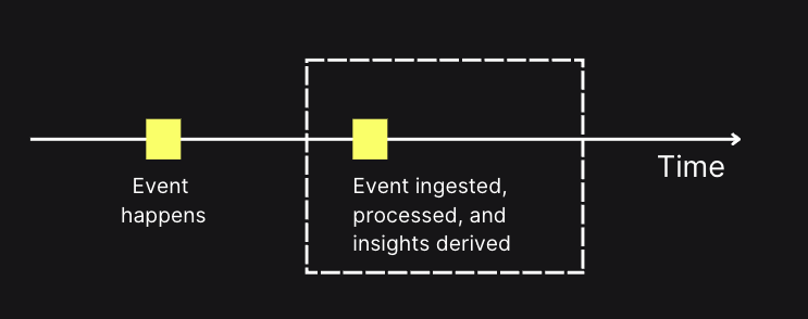 When comparing real-time analytics with batch analytics, the key difference is latency i.e. how long it takes from when an event happens until you gain insight from it.